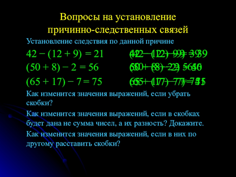 Как изменится значения выражений, если в скобках будет дана не сумма чисел, а их разность? Докажите.