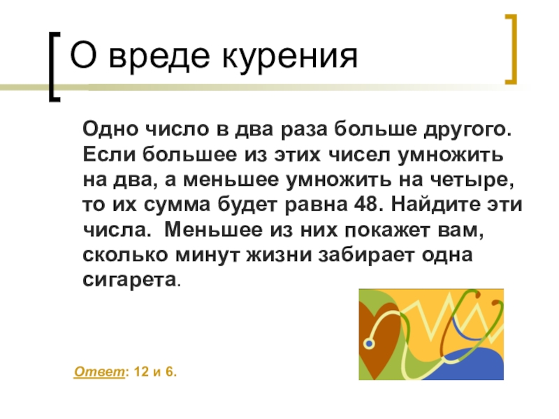 Найдите эти числа, и вы узнаете, сколько лет полноценной жизни забирает табак у курильщиков и сколько лет в среднем живут в России мужчины.