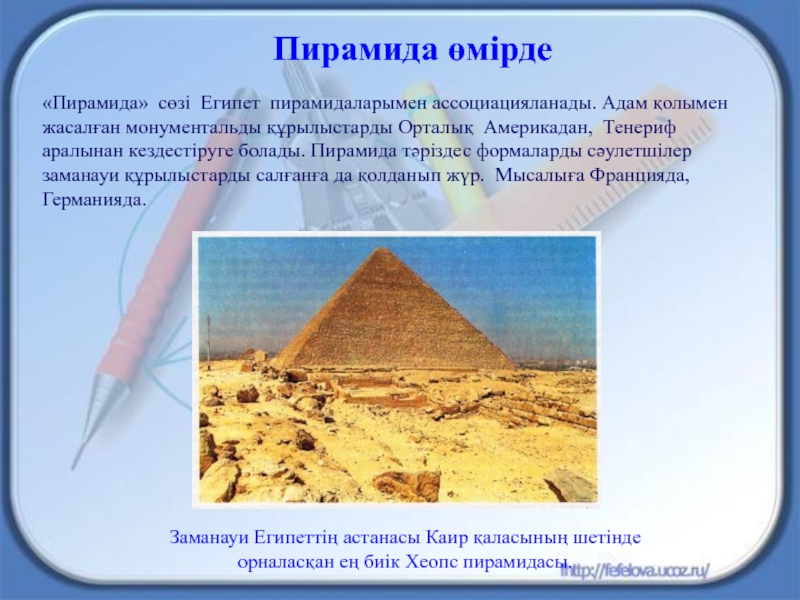 «Пирамида» — грек сөзі… Зерттеушілердің пікірі бойынша бидайдың үйіндісі пирамида ұғымының бастауы болған дейді. Тағы да бір бұл сөз тәтті нанды пирамида тәріздес етіп, үшбұрыштап кесуден шыққан деген пікір де бар.