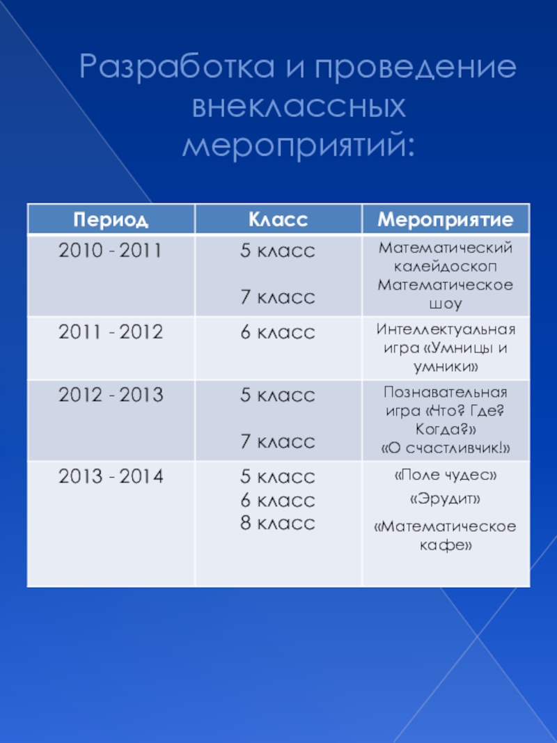 Слайд 9Разработка и проведение внеклассных мероприятий: