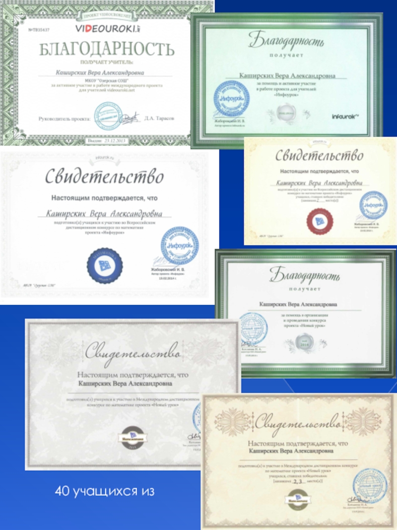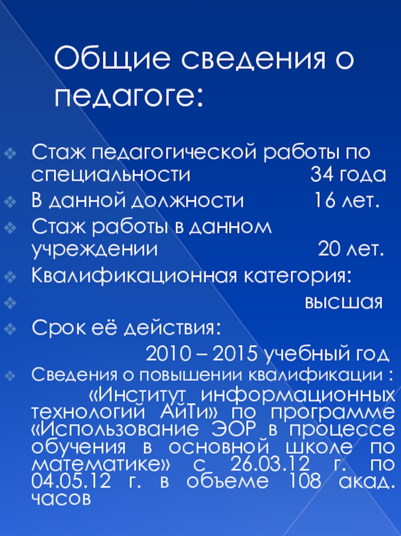 «Институт информационных технологий АйТи» по программе «Использование ЭОР в процессе обучения в основной школе по математике» с 26.03.12 г. по 04.05.12 г. в объеме 108 акад. часов