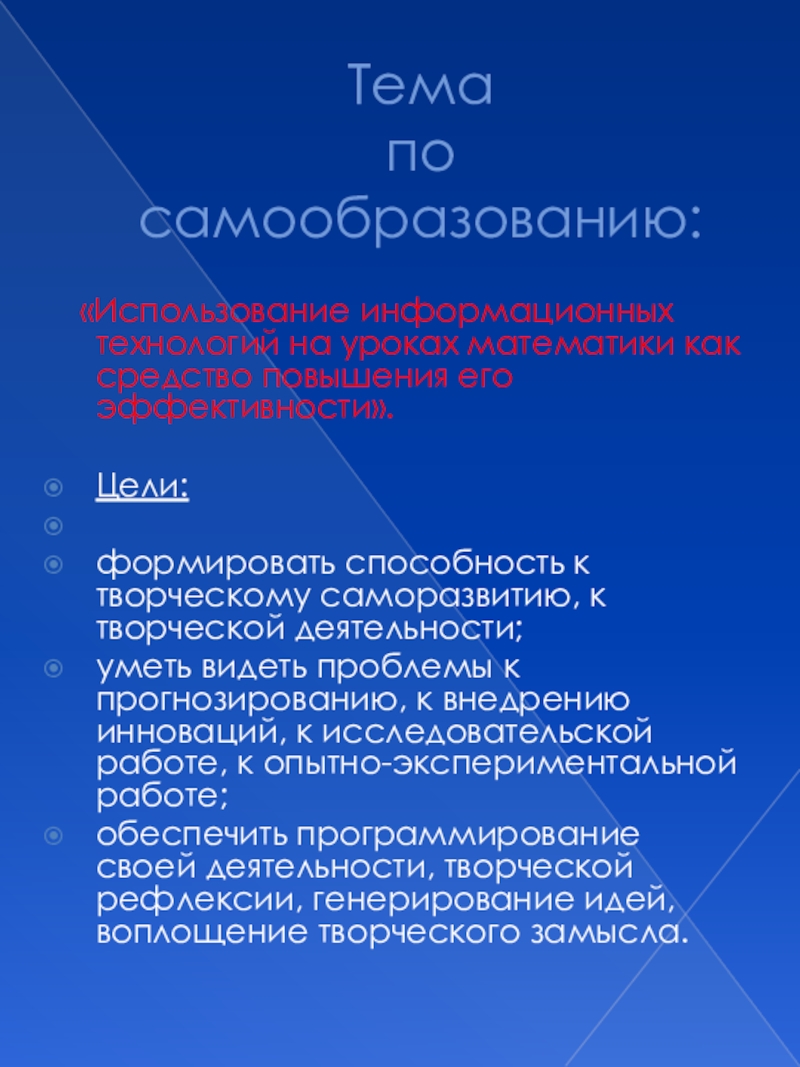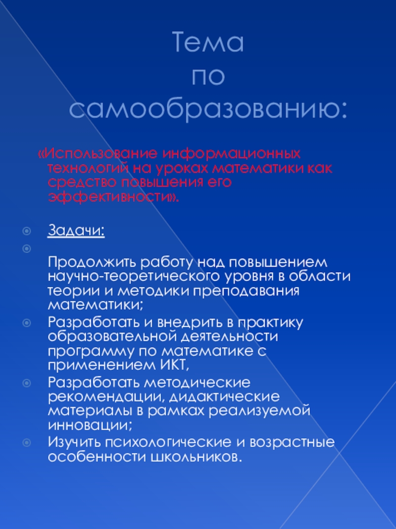 Продолжить работу над повышением научно-теоретического уровня в области теории и методики преподавания математики;