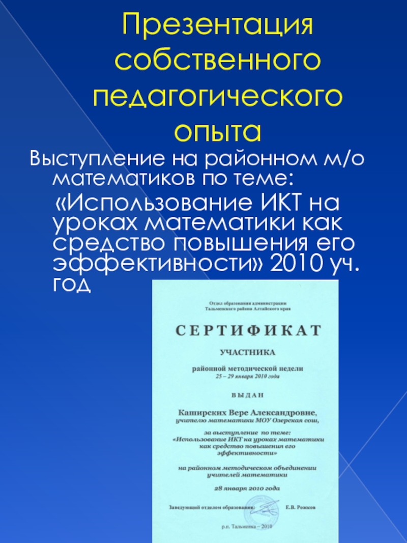 «Использование ИКТ на уроках математики как средство повышения его эффективности» 2010 уч.год