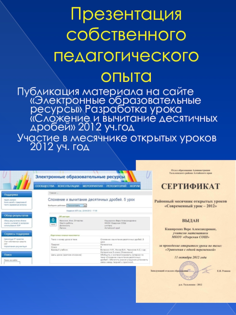 Публикация материала на сайте «Электронные образовательные ресурсы» Разработка