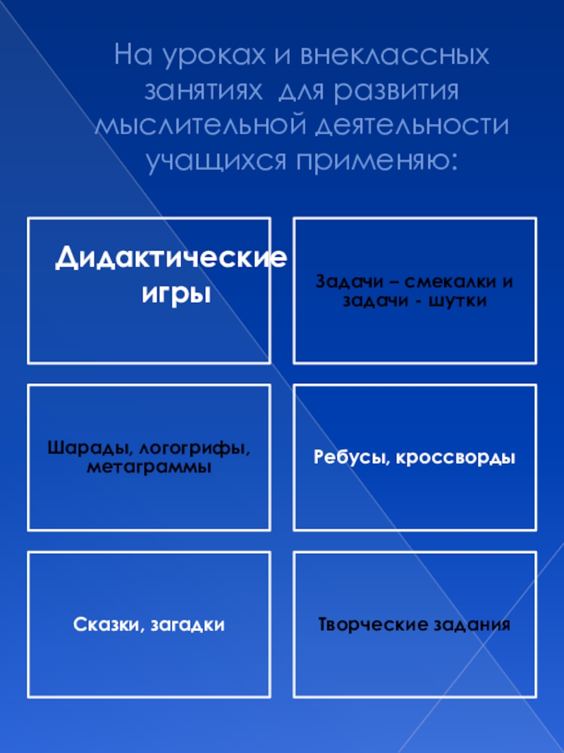 Слайд 23На уроках и внеклассных занятиях для развития мыслительной деятельности учащихся применяю: