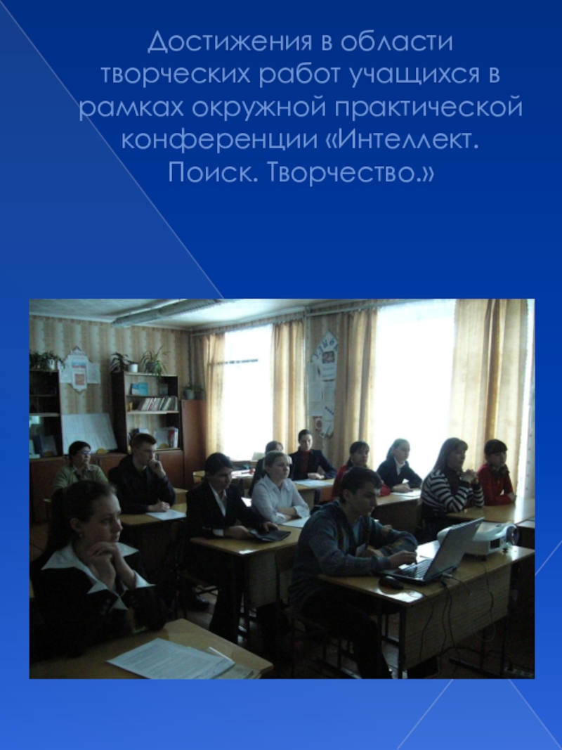 Слайд 14Достижения в области творческих работ учащихся в рамках окружной практической конференции