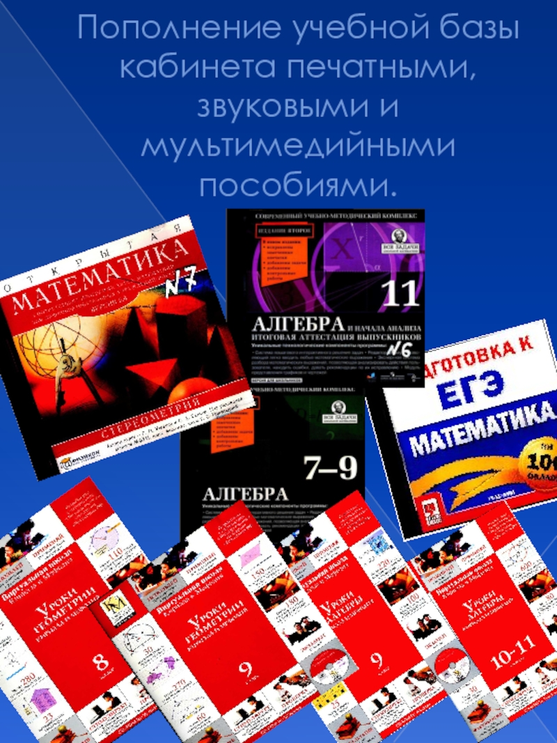 Слайд 26Пополнение учебной базы кабинета печатными, звуковыми и мультимедийными пособиями.