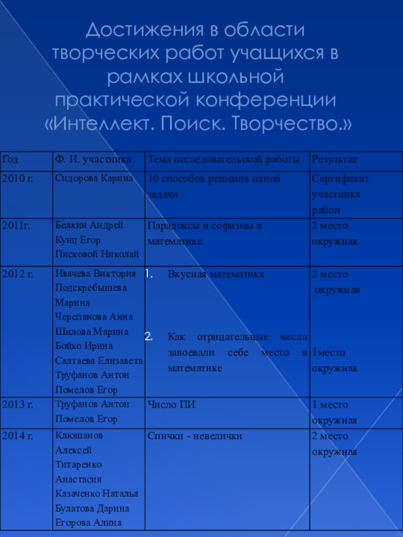 Слайд 15Достижения в области творческих работ учащихся в рамках школьной практической конференции