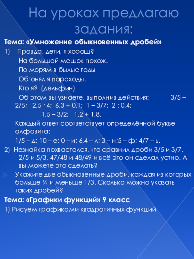Об этом вы узнаете, выполнив действия: 3/5 – 2/5; 2,5 · 4; 6,3 + 0,1; 1 – 3/7; 2 : 0,4;