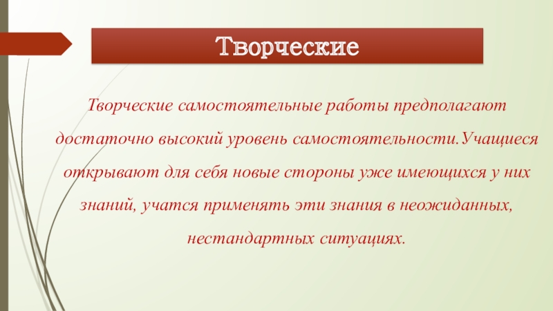 3. Связывая изучение теоретических вопросов с практической деятельностью, самостоятельные работы дают возможность учащимся самим ликвидировать пробелы, расширять знания, творчески применять их в решении различных задач;