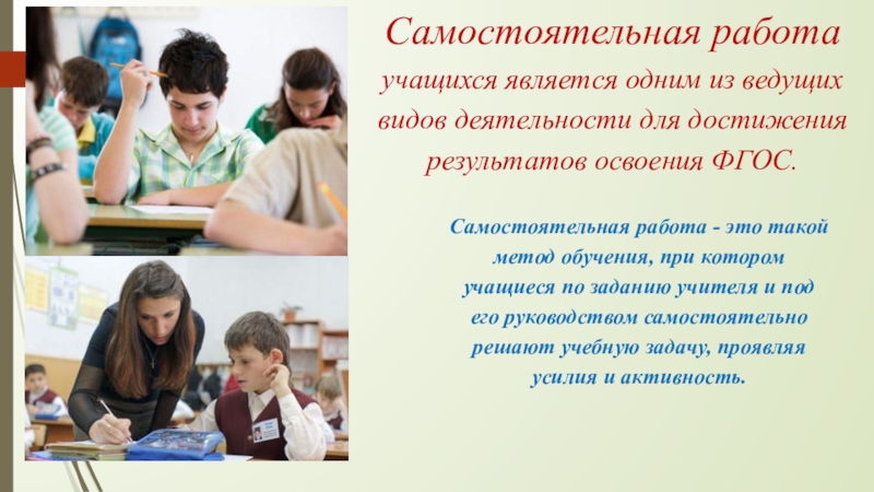 Самостоятельная работа - это такой метод обучения, при котором учащиеся по заданию учителя и под его руководством самостоятельно решают учебную задачу, проявляя усилия и активность.