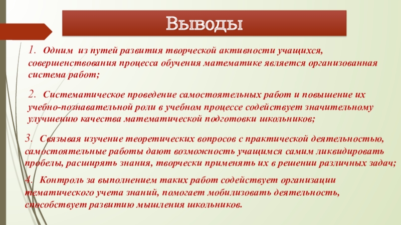 2. Систематическое проведение самостоятельных работ и повышение их учебно-познавательной роли в учебном процессе содействует значительному улучшению качества математической подготовки школьников;