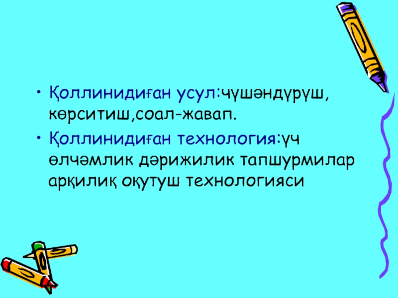 Қоллинидиған усул:чүшәндүрүш,көрситиш,соал-жавап.Қоллинидиған технология:үч өлчәмлик дәрижилик тапшурмилар арқилиқ оқутуш технологияси