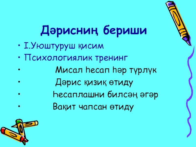 Дәрисниң беришиI.Уюштуруш қисимПсихологиялик тренинг      Мисал һесап һәр түрлүк