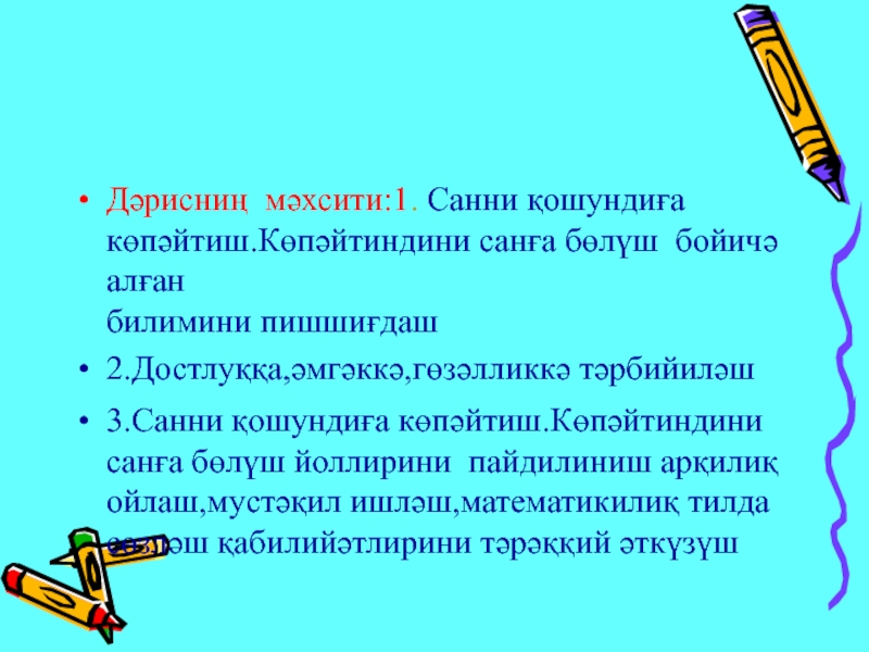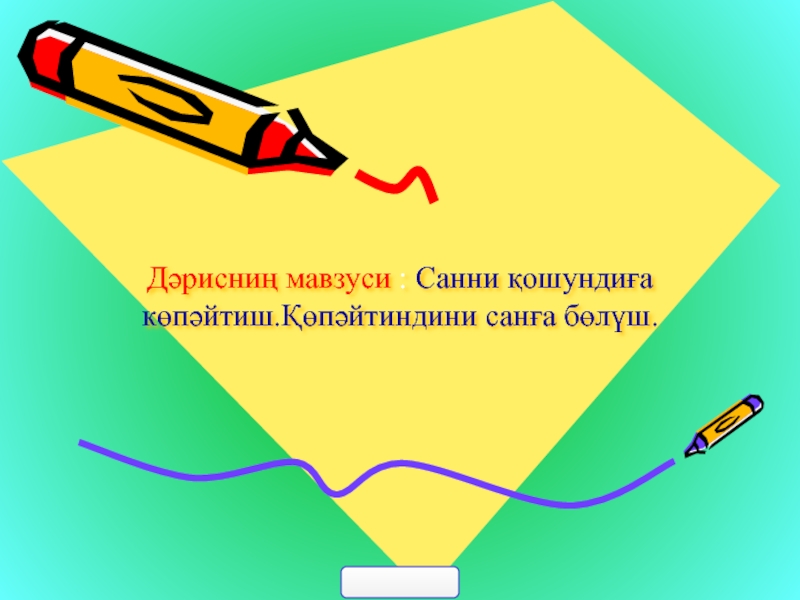 Слайд 2 Дәрисниң мавзуси : Санни қошундиға көпәйтиш.Қөпәйтиндини санға бөлүш.