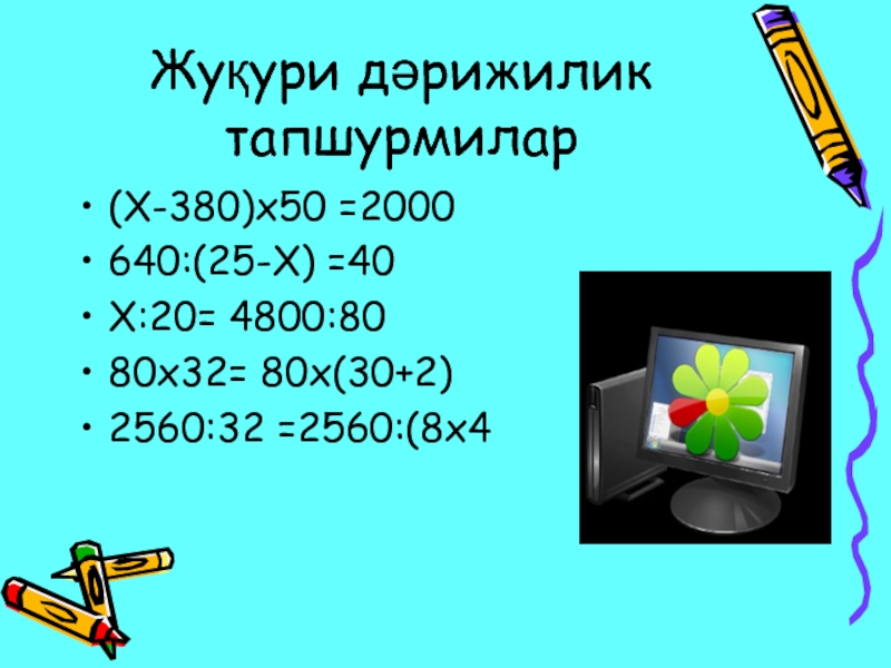 Жуқури дәрижилик тапшурмилар(Х-380)х50 =2000640:(25-Х) =40Х:20= 4800:8080х32= 80х(30+2)2560:32 =2560:(8х4