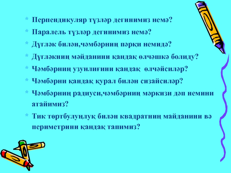 Перпендикуляр түзләр дегинимиз немә?Паралель түзләр дегинимиз немә?Дүгләк билән,чәмбәрниң пәрқи немидә?Дүгләкниң мәйданини қандақ өлчәшкә болиду?Чәмбәрниң узунлиғини қандақ өлчәйсиләр?Чәмбәрни