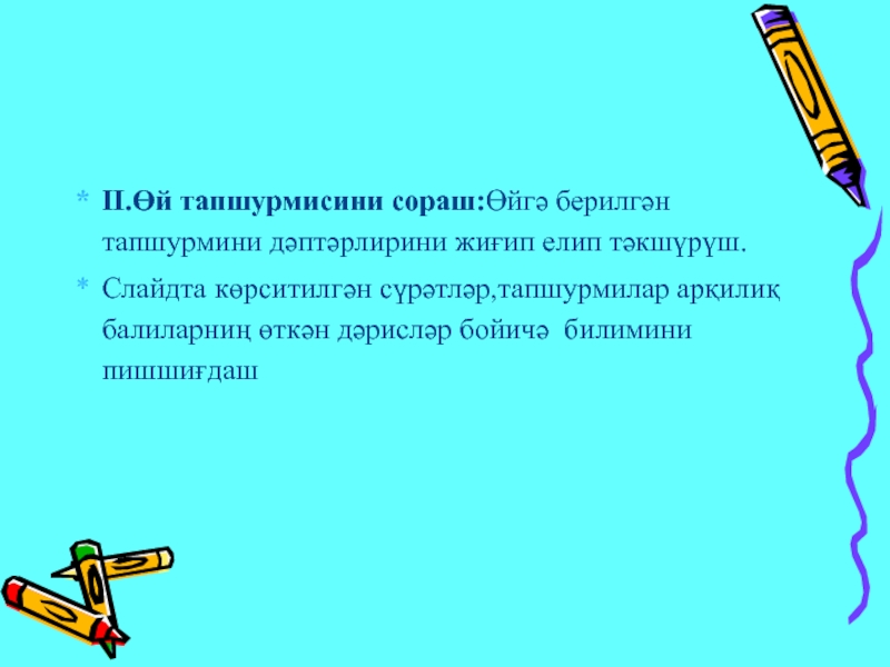 Слайд 8ІІ.Өй тапшурмисини сораш:Өйгә берилгән тапшурмини дәптәрлирини жиғип елип тәкшүрүш.