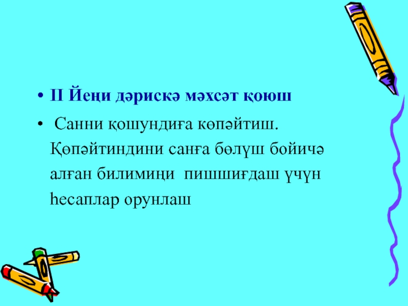 ІІ Йеңи дәрискә мәхсәт қоюш Санни қошундиға көпәйтиш.Қөпәйтиндини санға бөлүш бойичә алған билимиңи пишшиғдаш үчүн һесаплар орунлаш
