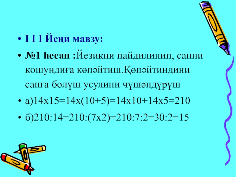 І І І Йеңи мавзу:№1 һесап :Йезиқни пайдилинип, санни қошундиға көпәйтиш.Қөпәйтиндини санға бөлүш усулини чүшәндүрүша)14х15=14х(10+5)=14х10+14х5=210б)210:14=210:(7х2)=210:7:2=30:2=15