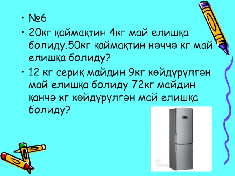 №6 20кг қаймақтин 4кг май елишқа болиду.50кг қаймақтин нәччә кг май елишқа болиду?12 кг сериқ майдин 9кг