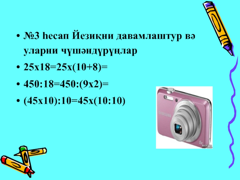№3 һесап Йезиқни давамлаштур вә уларни чүшәндүрүңлар25х18=25х(10+8)=450:18=450:(9х2)=(45х10):10=45х(10:10)