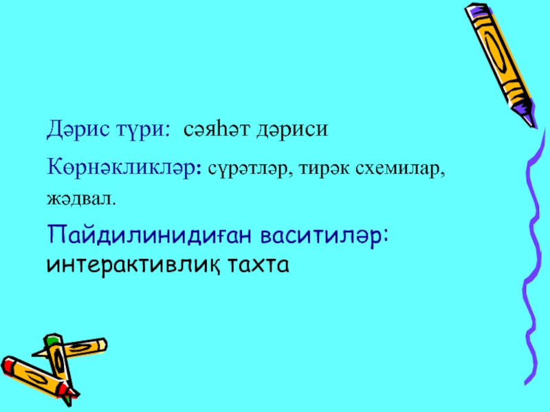 Дәрис түри: сәяһәт дәриси 		Көрнәкликләр: сүрәтләр, тирәк схемилар, жәдвал.Пайдилинидиған васитиләр:интерактивлиқ тахта