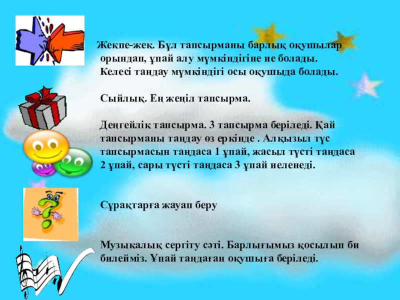 барлық оқушылар орындап, ұпай алу мүмкіндігіне ие болады. Келесі таңдау мүмкіндігі осы оқушыда болады. Сыйлық. Ең жеңіл тапсырма. Деңгейлік тапсырма. 3 тапсырма беріледі. Қай тапсырманы таңдау өз еркінде . Алқызыл түс тапсырмасын таңдаса 1 ұпай, жасыл түсті таңдаса 2 ұпай, сары түсті таңдаса 3 ұпай иеленеді. Сұрақтарға жауап беру Музыкалық сергіту сәті. Барлығымыз қосылып би билейміз. Ұпай таңдаған оқушыға беріледі.