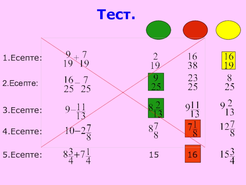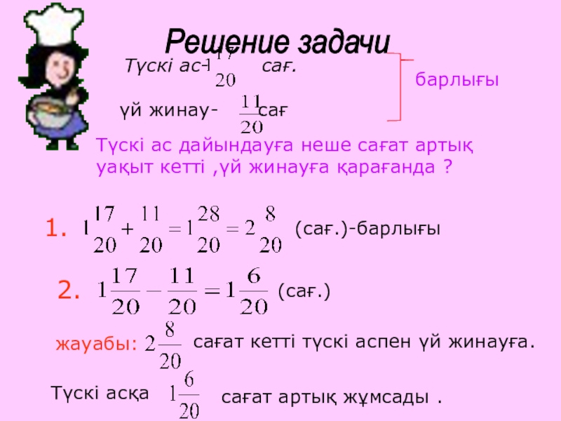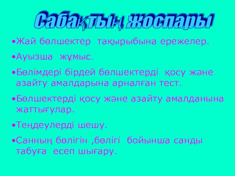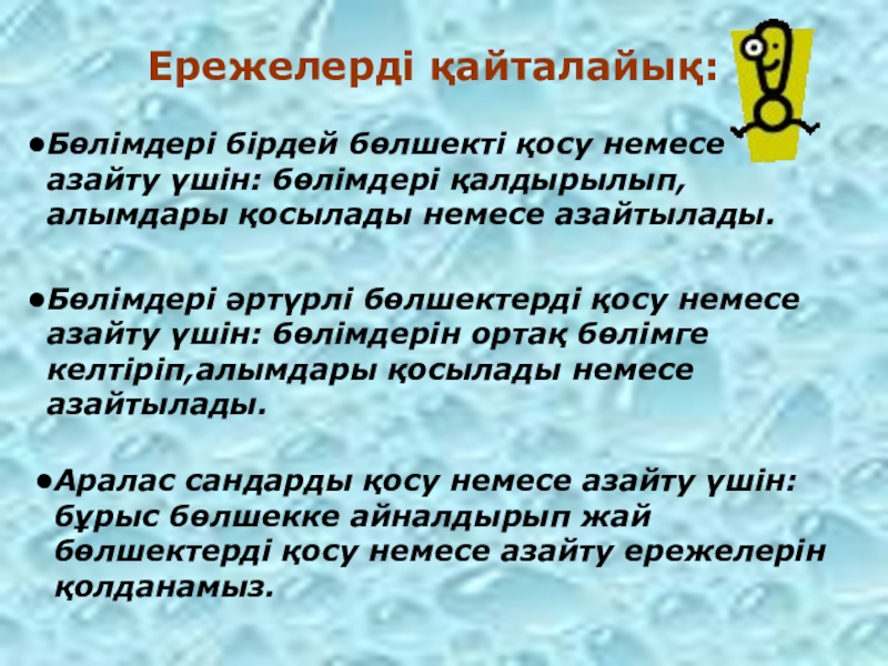 Бөлімдері әртүрлі бөлшектерді қосу немесе азайту үшін: бөлімдерін ортақ бөлімге келтіріп,алымдары қосылады немесе азайтылады.