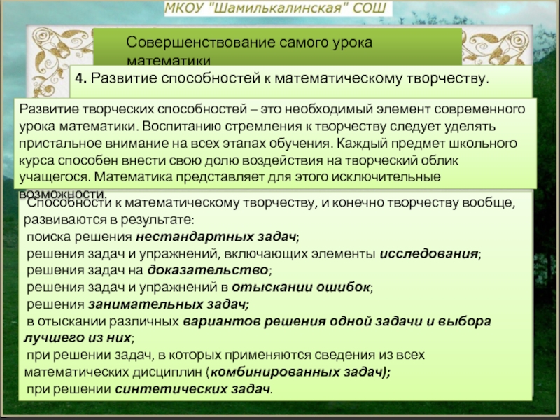 Развитие творческих способностей – это необходимый элемент современного урока математики. Воспитанию стремления к творчеству следует уделять пристальное внимание на всех этапах обучения. Каждый предмет школьного курса способен внести свою долю воздействия на творческий облик учащегося. Математика представляет для этого исключительные возможности.