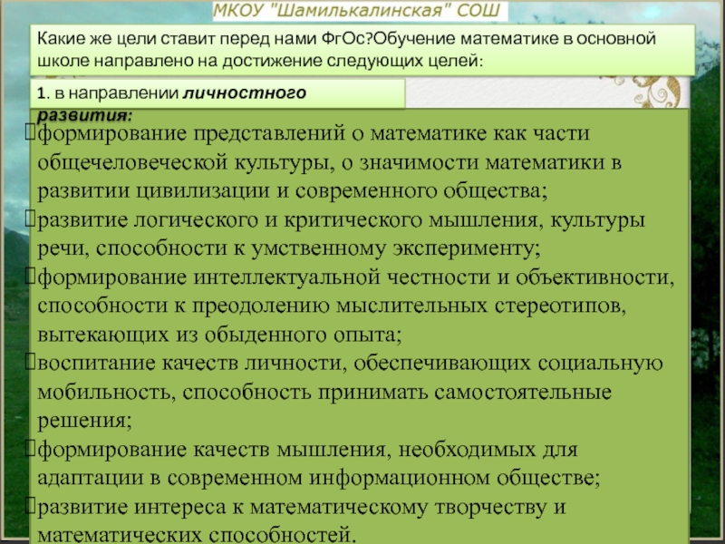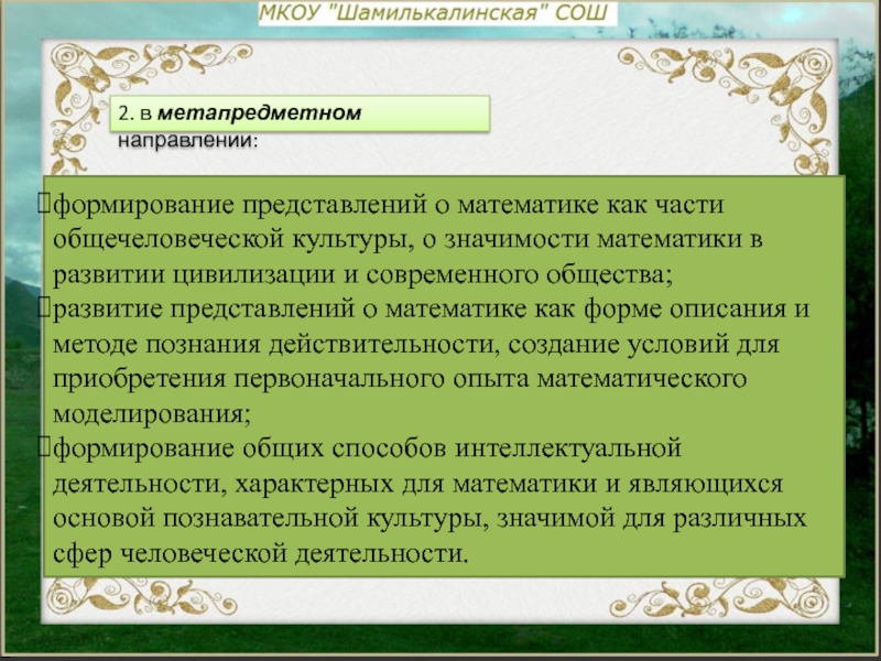 формирование представлений о математике как части общечеловеческой культуры, о значимости математики в развитии цивилизации и современного общества;