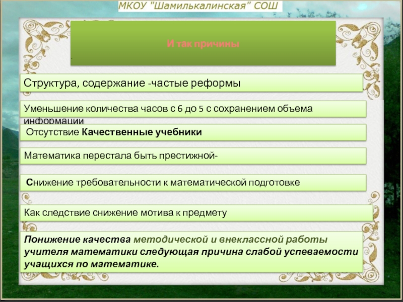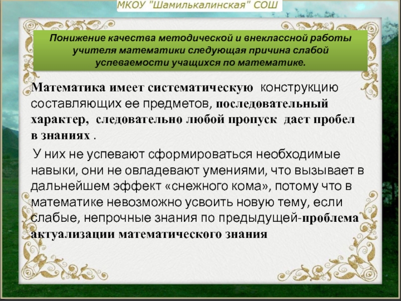 Понижение качества методической и внеклассной работы учителя математики следующая причина слабой успеваемости учащихся по математике.