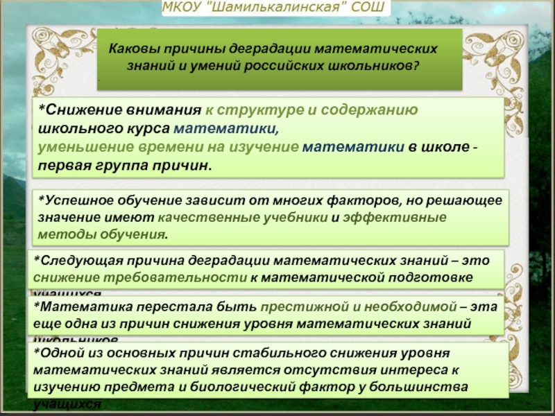 уменьшение времени на изучение математики в школе - первая группа причин.