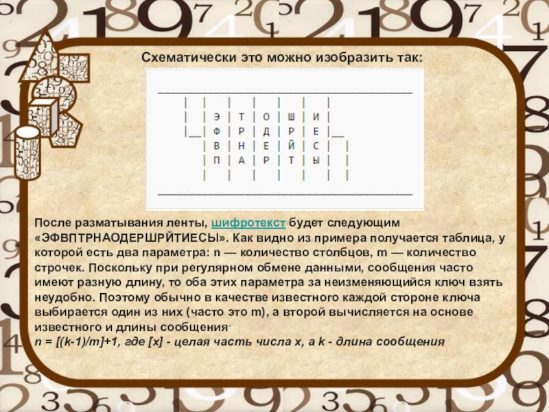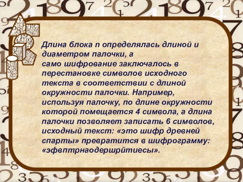 Слайд 4Длина блока n определялась длиной и диаметром палочки, а само шифрование заключалось в