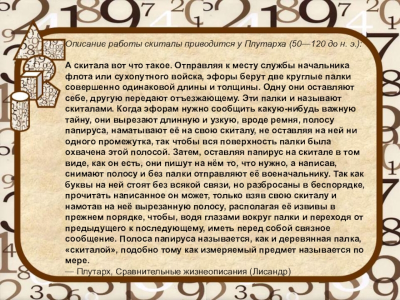 Слайд 12Описание работы скиталы приводится у Плутарха (50—120 до н. э.):