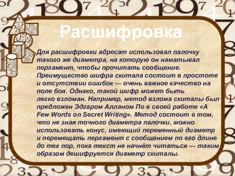 Слайд 8Для расшифровки адресат использовал палочку такого же диаметра, на которую он наматывал