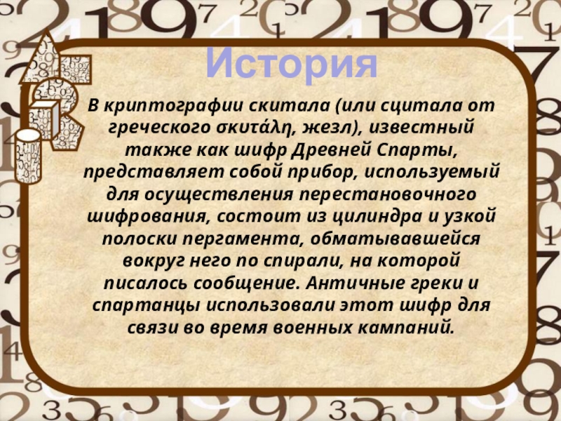 Слайд 2В криптографии скитала (или сцитала от греческого σκυτάλη, жезл), известный также как шифр Древней Спарты, представляет собой