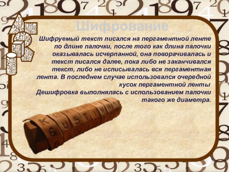 Слайд 3Шифруемый текст писался на пергаментной ленте по длине палочки, после того