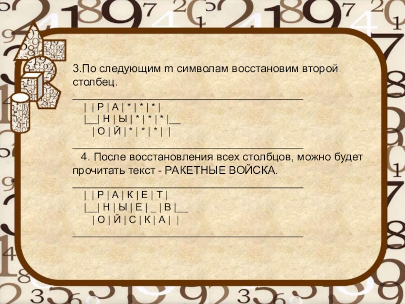 4. После восстановления всех столбцов, можно будет прочитать текст - РАКЕТНЫЕ ВОЙСКА.