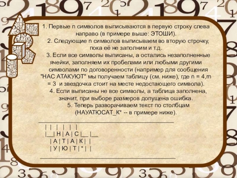 символами по договоренности (например для сообщения "НАС АТАКУЮТ" мы получаем таблицу (см. ниже), где n = 4,m = 3 и звездочка стоит на месте недостающего символа).