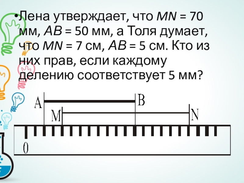 а Толя думает, что MN = 7 см, АВ = 5 см. Кто из них прав, если каждому делению соответствует 5 мм?