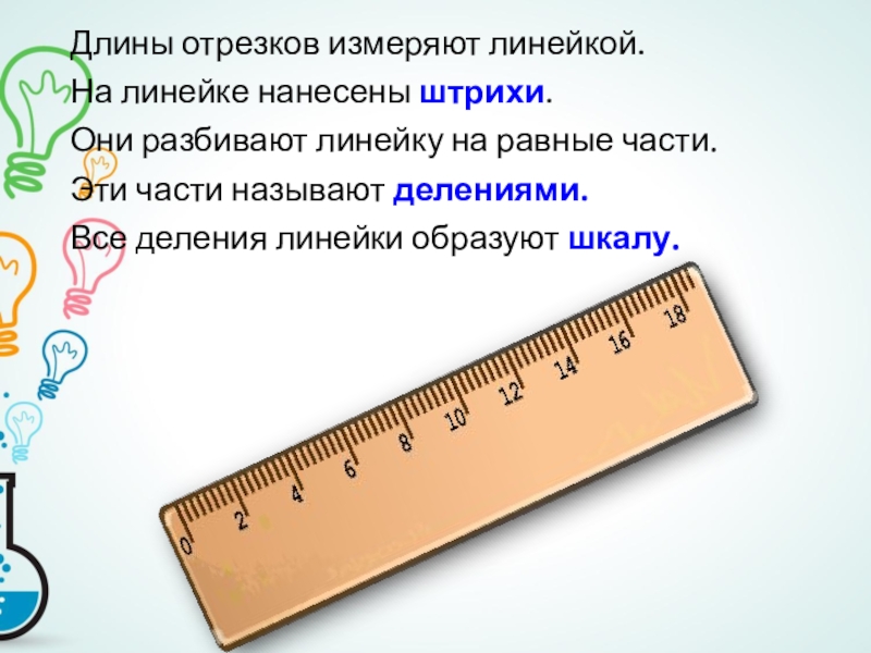 Длины отрезков измеряют линейкой. На линейке нанесены штрихи.Они разбивают линейку на равные части. Эти части называют делениями.Все деления линейки образуют шкалу.