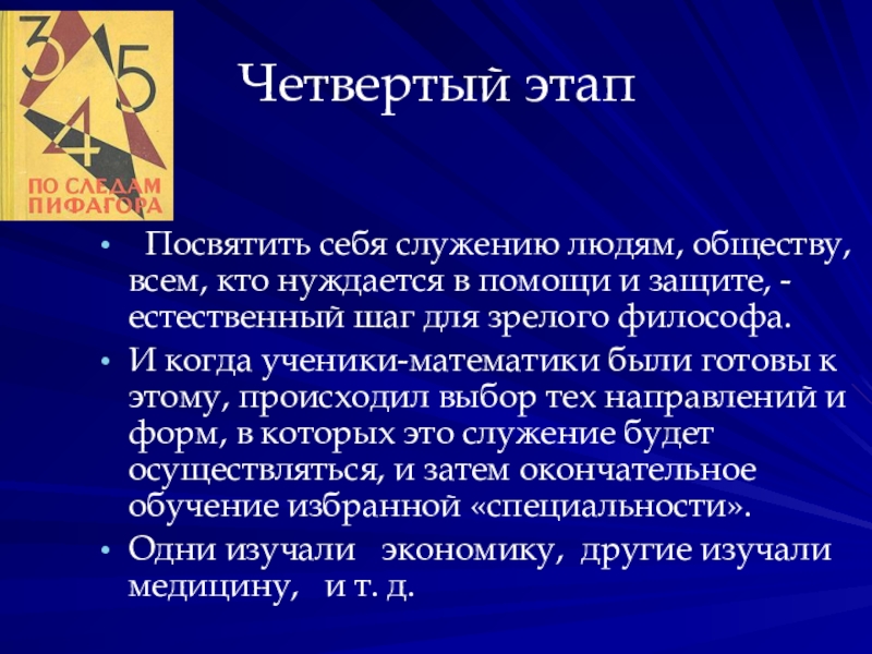 И когда ученики-математики были готовы к этому, происходил выбор тех направлений и форм, в которых это служение будет осуществляться, и затем окончательное обучение избранной «специальности».