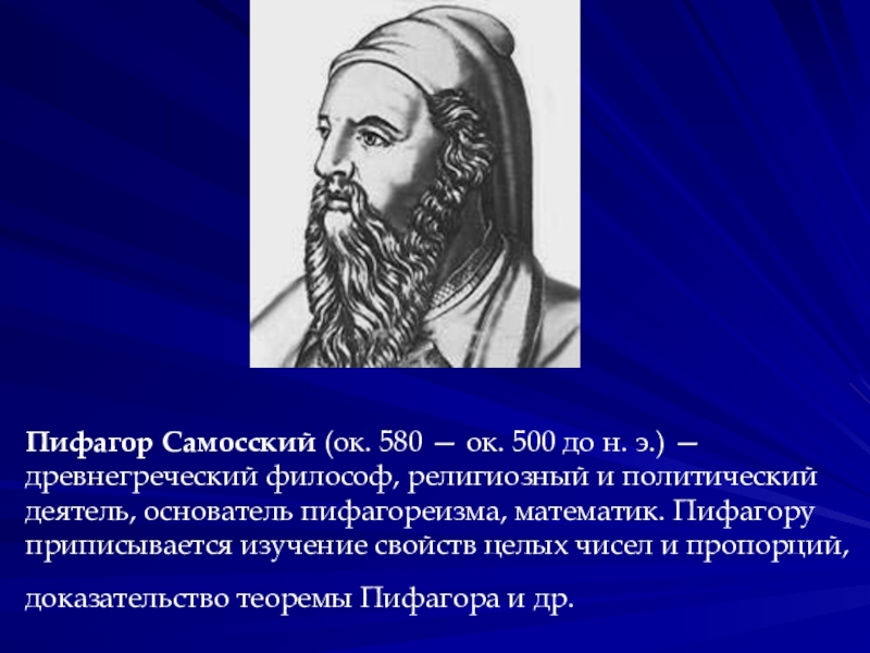 древнегреческий философ, религиозный и политический деятель, основатель пифагореизма, математик. Пифагору приписывается изучение свойств целых чисел и пропорций, доказательство теоремы Пифагора и др.