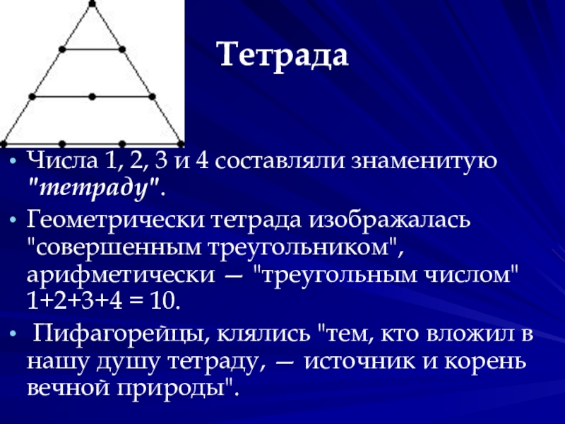 изображалась "совершенным треугольником", арифметически — "треугольным числом" 1+2+3+4 = 10.