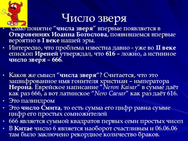 Каков же смысл “числа зверя“? Считается, что это зашифрованное имя гонителя христиан – императора Нерона. Еврейское написание “Neron Kaisar” в сумме даёт как раз 666, а вот латинское “Nero Caesar” как раз даёт 616.