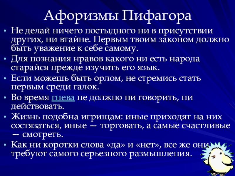 Акусматикам Пифагор «предписывал пятилетнее молчание, испытывая их способности воздерживаться, так как молчание - наиболее трудный вид воздержания».