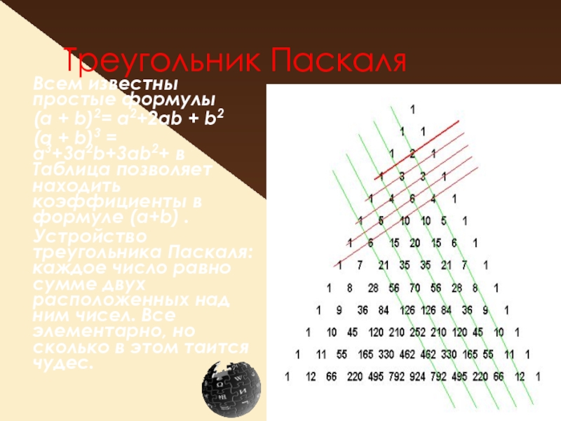 + b)3 = a3+3a2b+3ab2+ в Таблица позволяет находить коэффициенты в формуле (а+b) .