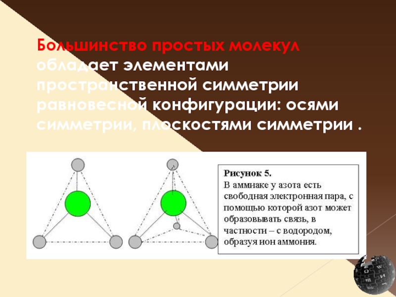 Слайд 19 Большинство простых молекул обладает элементами пространственной симметрии равновесной конфигурации: осями симметрии,