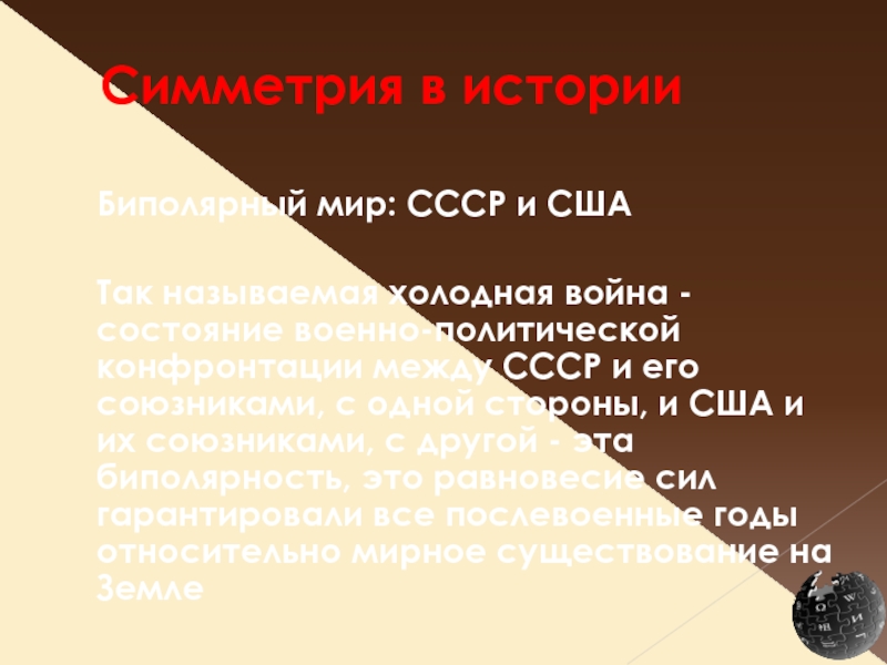 Так называемая холодная война - состояние военно-политической конфронтации между СССР и его союзниками, с одной стороны, и США и их союзниками, с другой - эта биполярность, это равновесие сил гарантировали все послевоенные годы относительно мирное существование на Земле